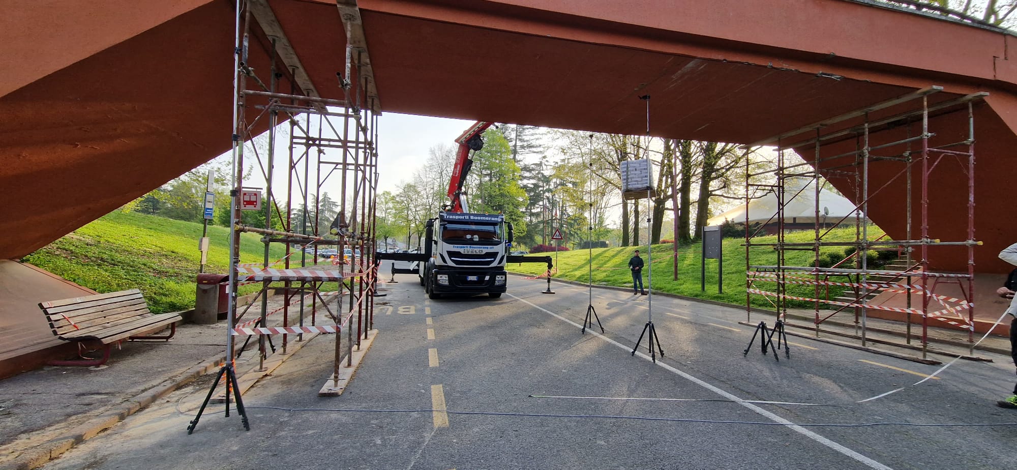 Appoggiati sul ponte alcuni bancali di cemento per eseguire tutte le misurazioni necessarie, verificando la tenuta dopo i lavori di riparazione eseguiti.