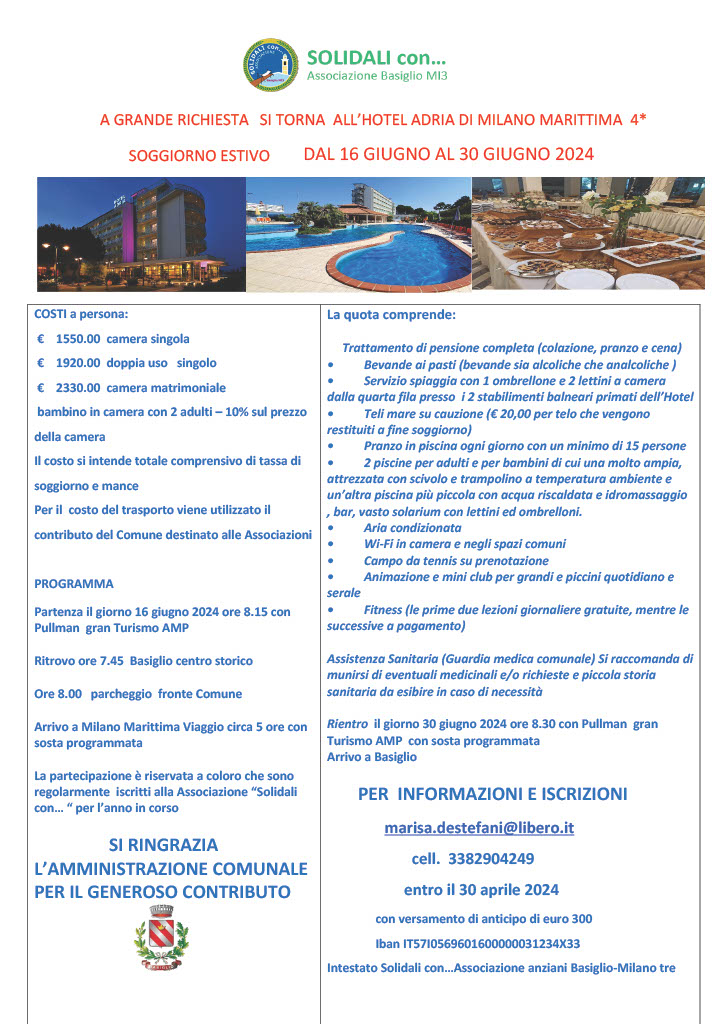 L’associazione “Solidali con…” in collaborazione e con il contributo del Comune di Basiglio, promuove anche quest'anno il soggiorno climatico per i cittadini over 65. La destinazione scelta è l'hotel Adria di Milano Marittima, che ospiterà la vacanza dal 16 al 30 giugno prossimi.