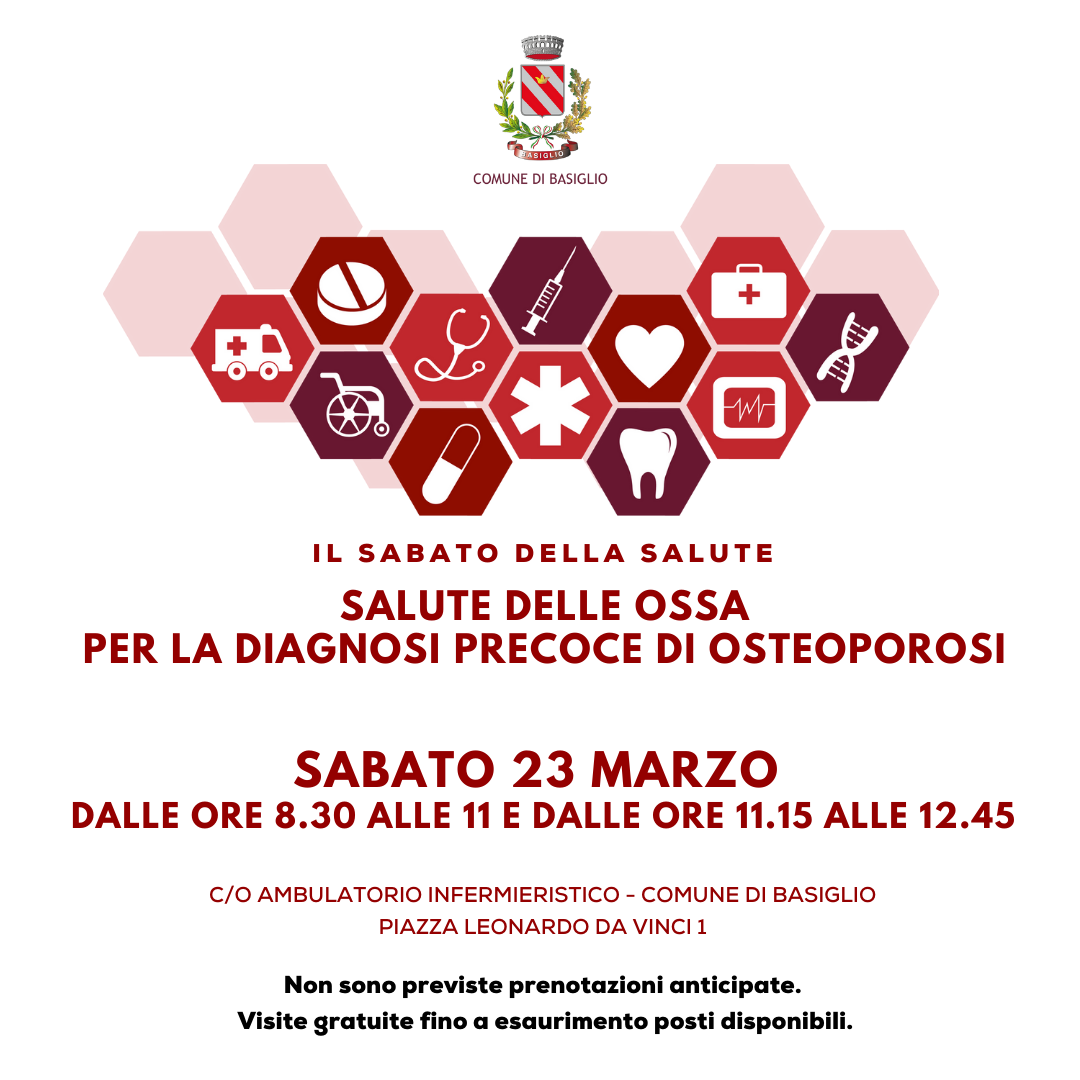 Sabato 23 marzo nell'ambulatorio infermieristico del Comune di Basiglio, dalle ore 8.30 alle ore 11 e dalle ore 11.15 alle ore 12.45, torna il “Sabato della Salute”, l’iniziativa di screening promossa dell’amministrazione comunale per favorire la prevenzione, aumentare la consapevolezza sui temi della salute e migliorare così il benessere della popolazione.