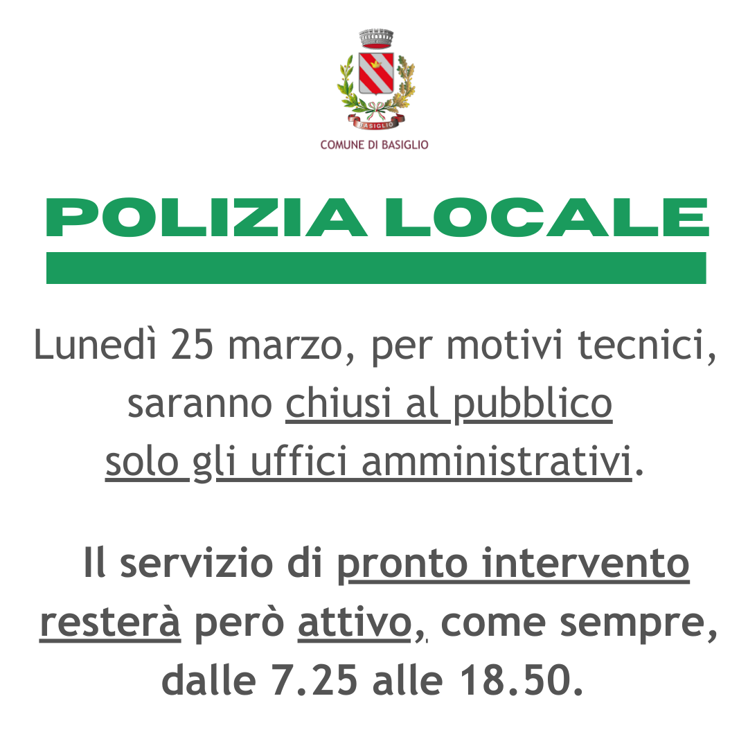 Si avvisano i cittadini che lunedì 25 marzo, per motivi tecnici, saranno chiusi al pubblico solo gli uffici amministrativi della Polizia Locale mentre il servizio di pronto intervento resterà attivo, come sempre, dalle 7.25 alle 18.50.