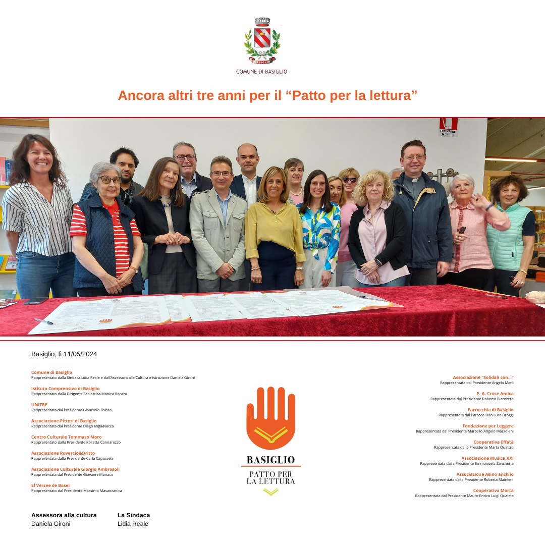 Il “patto per la lettura” è uno strumento delle politiche di promozione del libro e della lettura che il Comune di Basiglio – riconosciuto come “Città che legge” dal Centro per il libro e la lettura – propone alle istituzioni pubbliche del paese, alle associazioni culturali, a tutti i soggetti privati, che riconoscono nella lettura una risorsa strategica su cui investire e un valore sociale da sostenere attraverso un’azione coordinata e congiunta a livello locale.