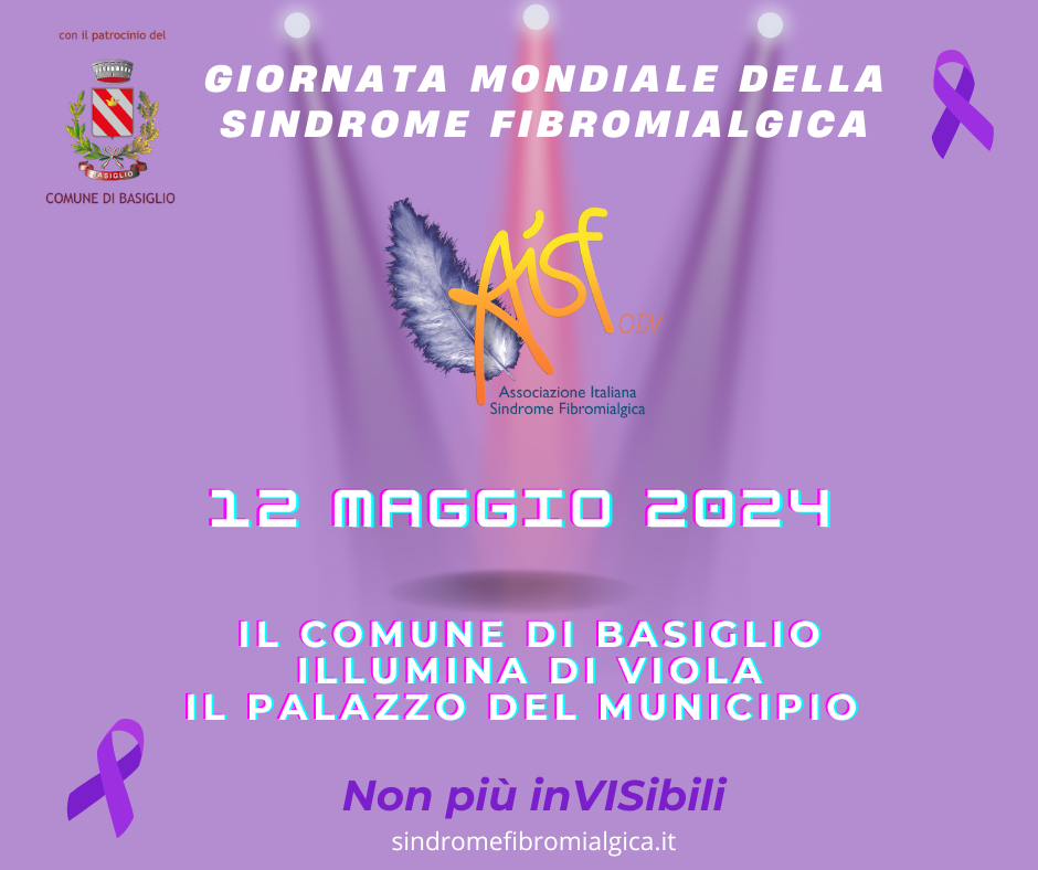 Il Comune di Basiglio, che ha patrocinato l’associazione AISF ODV con la campagna “Non pił invisibili”, ha voluto rendere “visibili” le migliaia di malati illuminando di viola il palazzo del municipio oltre ad aderire alla campagna di raccolta firme, terminata il 30 aprile, per sostenere la petizione popolare varata dal CFU ITALIA, Comitato Fibromialgici Uniti – ITALIA, volti al riconoscimento della fibromialgia come malattia cronica e invalidante e inserimento nei LEA (Livelli Essenziali di Assistenza).