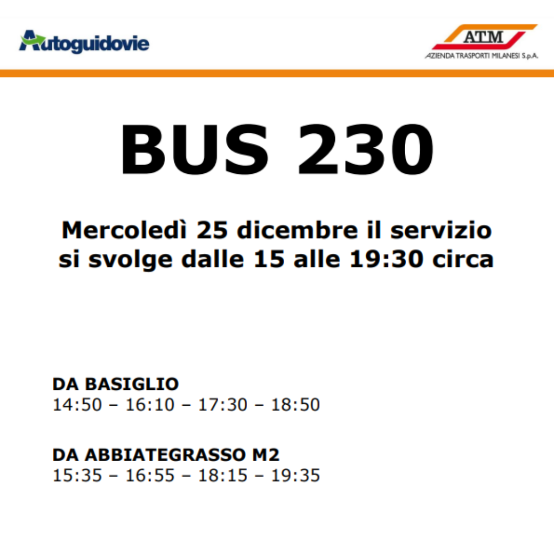 ATM ha comunicato gli orari della linea 230 durante il periodo delle festivitą natalizie.