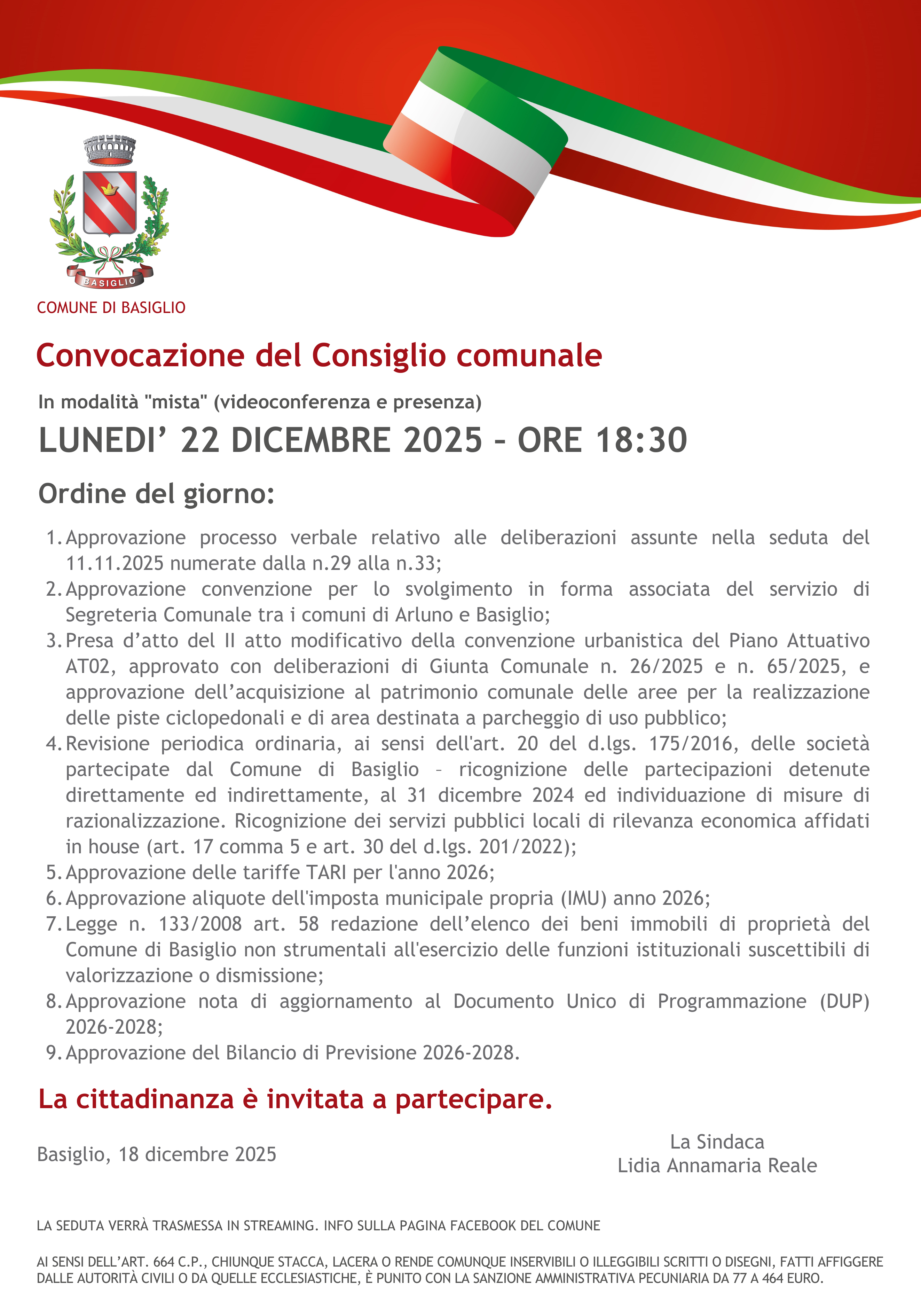 Lunedì 22 dicembre alle ore 18:30 è convocata la seduta del Consiglio comunale in modalità mista. In allegato l'ordine del giorno.