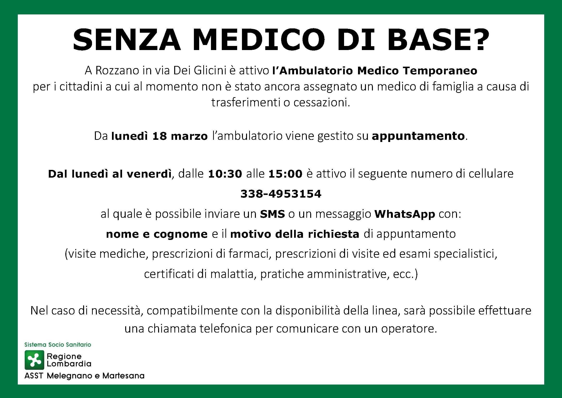 Nel campo delle attività promosse sul territorio dell'Ambito Distrettuale Visconteo Sud Milano, di cui fa parte il Comune di BasiglioASST comunica ai cittadini privi al momento del medico di base che a Rozzano in via Dei Glicini è attivo l’Ambulatorio Medico Temporaneo.
