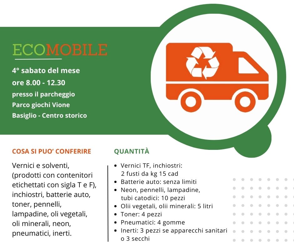 Ricordiamo alla cittadinanza che Sabato 23 marzo dalle ore 8 alle ore 12.30 presso il parcheggio del Parco Giochi Vione - Basiglio Centro Storico - sarà presente l'ECOMOBILE per la raccolta dei rifiuti speciali.