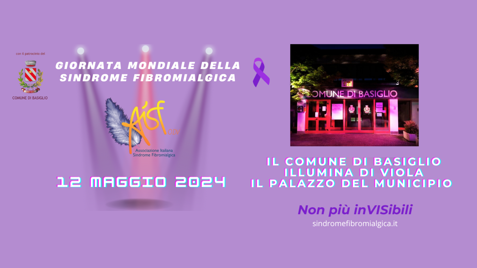 Il Comune di Basiglio, che ha patrocinato l’associazione AISF ODV con la campagna “Non più invisibili”, ha voluto rendere “visibili” le migliaia di malati illuminando di viola il palazzo del municipio oltre ad aderire alla campagna di raccolta firme, terminata il 30 aprile, per sostenere la petizione popolare varata dal CFU ITALIA, Comitato Fibromialgici Uniti – ITALIA, volti al riconoscimento della fibromialgia come malattia cronica e invalidante e inserimento nei LEA (Livelli Essenziali di Assistenza).