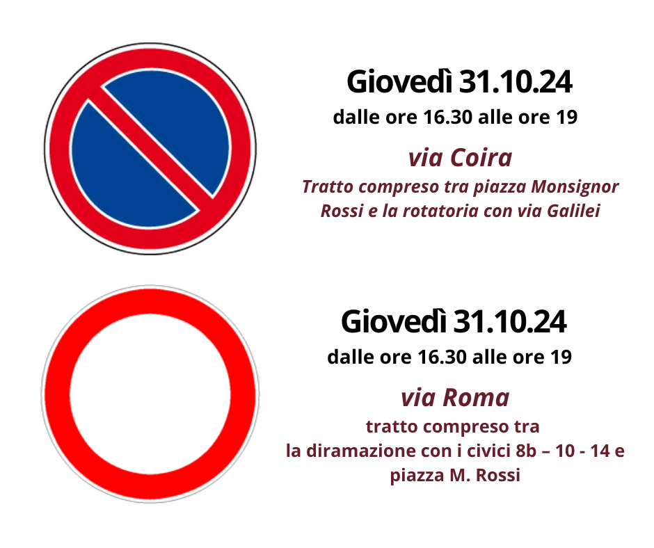 Per consentire la realizzazione dell’evento il 31 ottobre č vietata la sosta in via Coira dalle ore 16.30 alle ore 19 nel tratto compreso tra il civico 2 ed il civico 4. Sarā inoltre vietata la circolazione in via Coira nel tratto compreso tra piazza M. Rossi e la rotatoria con la via Galilei e in via Roma nel tratto compreso tra la diramazione con i civici 8b – 10 - 14 e piazza M. Rossi.