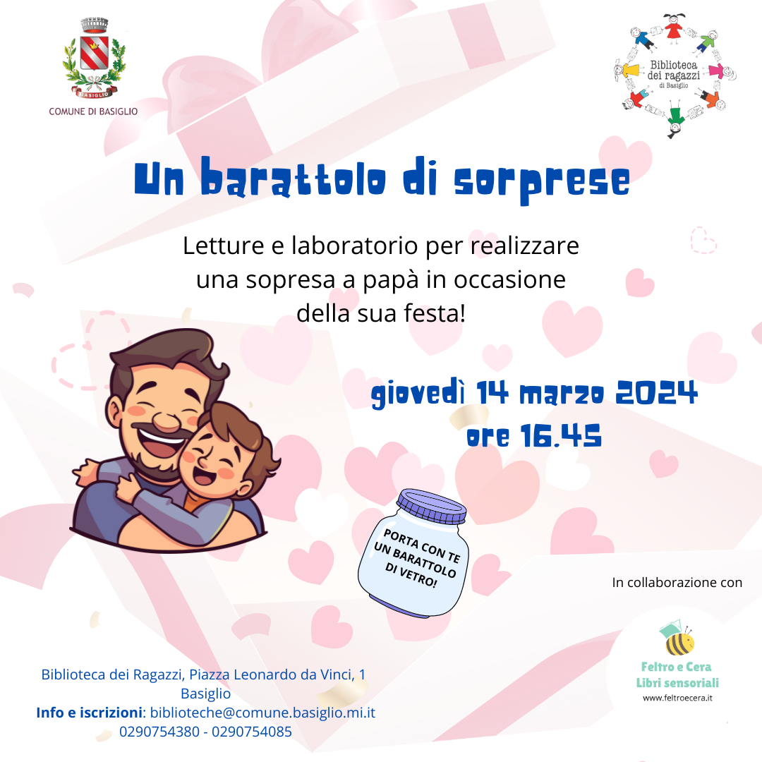 Giovedì 14 marzo alle ore 16.45 presso la Biblioteca dei ragazzi in Piazza Leonardo da Vinci 1 aspettiamo numerosi bambini per preparare insieme un bel regalo per il papà. La sua festa si avvicina e per lui.... UN BARATTOLO DI SORPRESE!