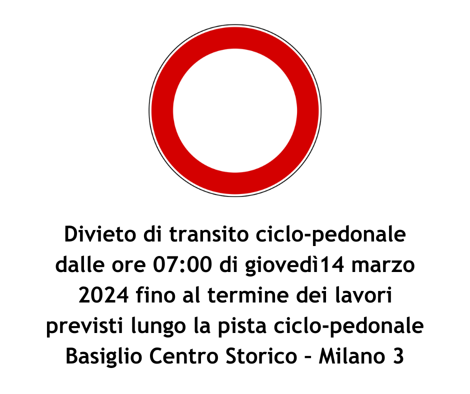 Dalle ore 7 di domani, giovedì 14 marzo fino al termine dei lavori, con ordinanza n. 6-24 allegata, viene istituto divieto di transito ciclo-pedonale lungo la ciclabile Basiglio Centro Storico – Milano 3 nel tratto compreso tra: