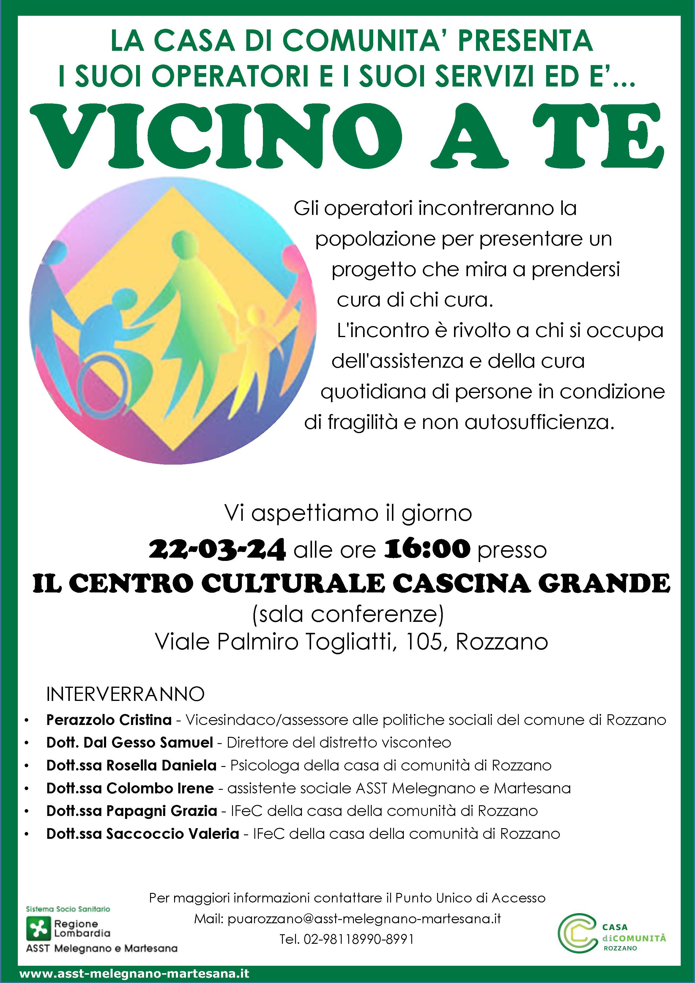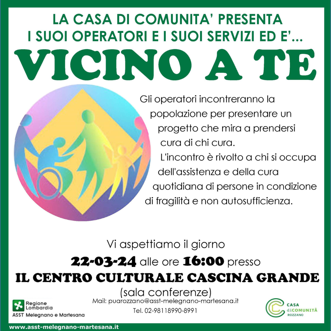Nel campo delle attivitā promosse tra i Comuni dell'Ambito Distrettuale Visconteo Sud Milano, ASST invita tutti i cittadini alla presentazione dei servizi "Vicino a te" promossi dalla Casa di Comunitā di zona.