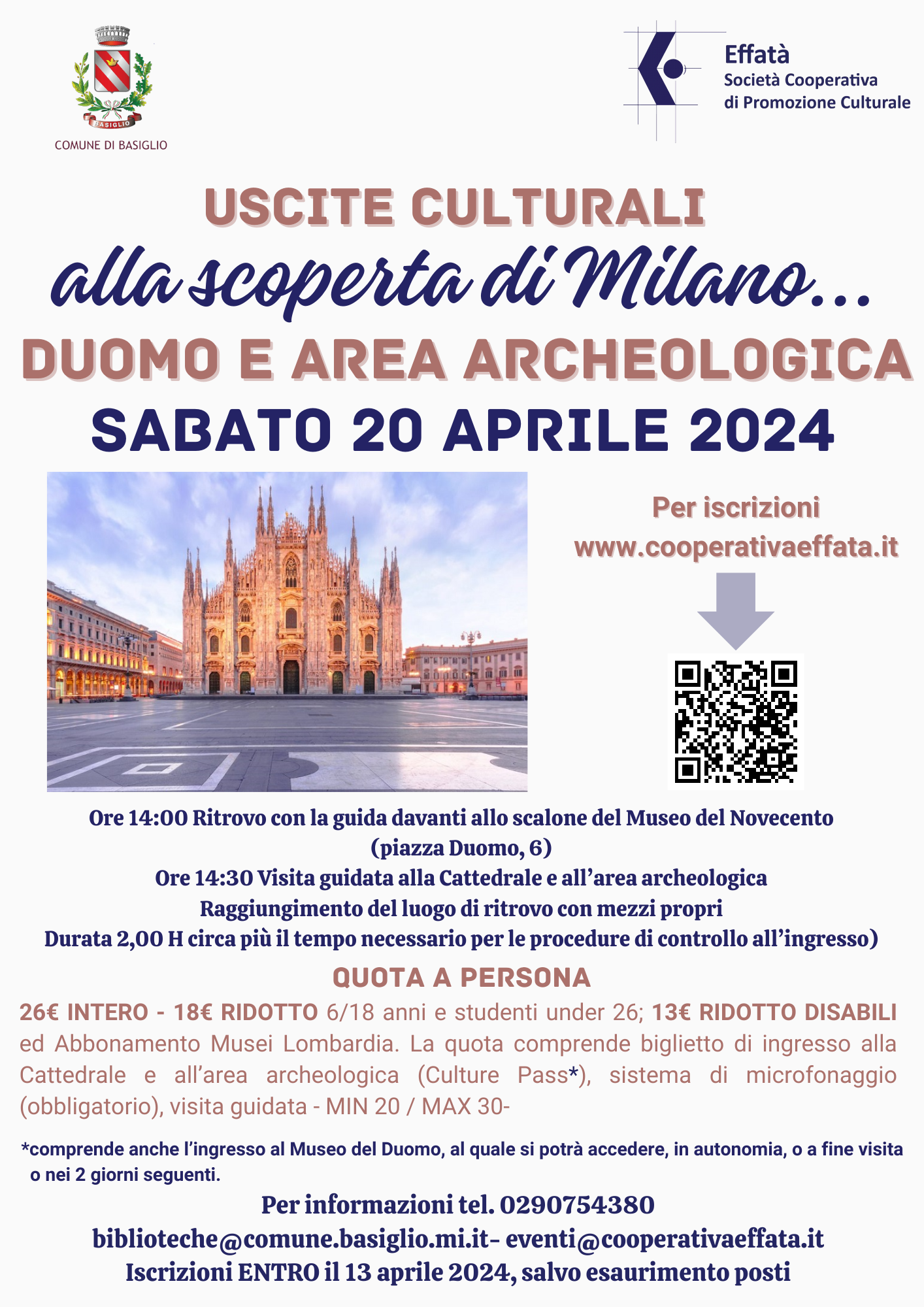 La societą cooperativa di promozione culturale Effatą e la biblioteca "Il Mulino di Vione" organizzano sabato 20 aprile la visita guidata al Duomo di Milano e all'area archeologica.