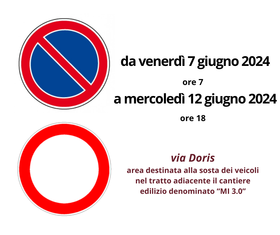 Per la sostituzione di un braccio della gru utilizzata nel cantiere denominato “MI 3.0”, dalle ore 7 di venerdì 7 giugno fino alle 18 di mercoledì 12 giugno sono vietati il transito e la sosta (con rimozione forzata) nel tratto di via Doris adiacente all’area dell’intervento edilizio.