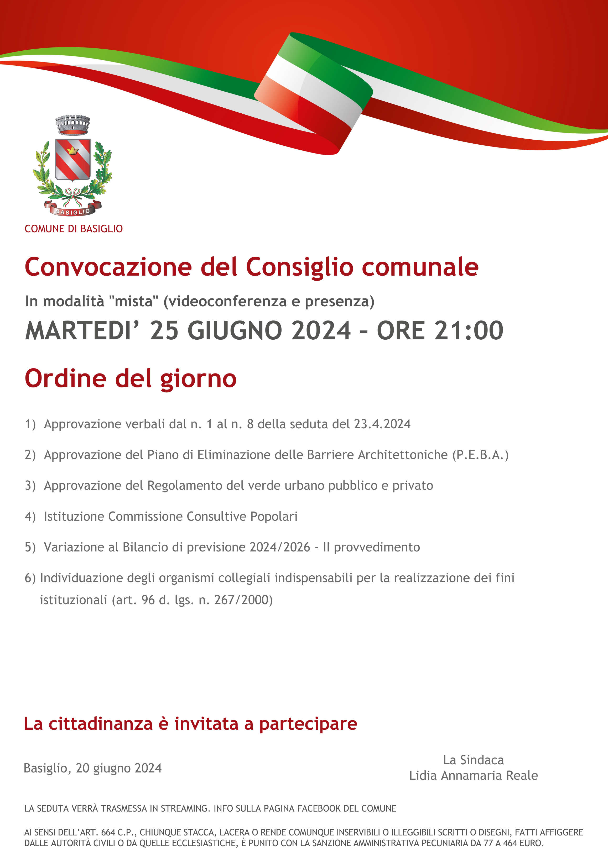 Martedì 25 giugno alle ore 21 è convocata la seduta del Consiglio comunale in modalità mista. In allegato l'ordine del giorno.