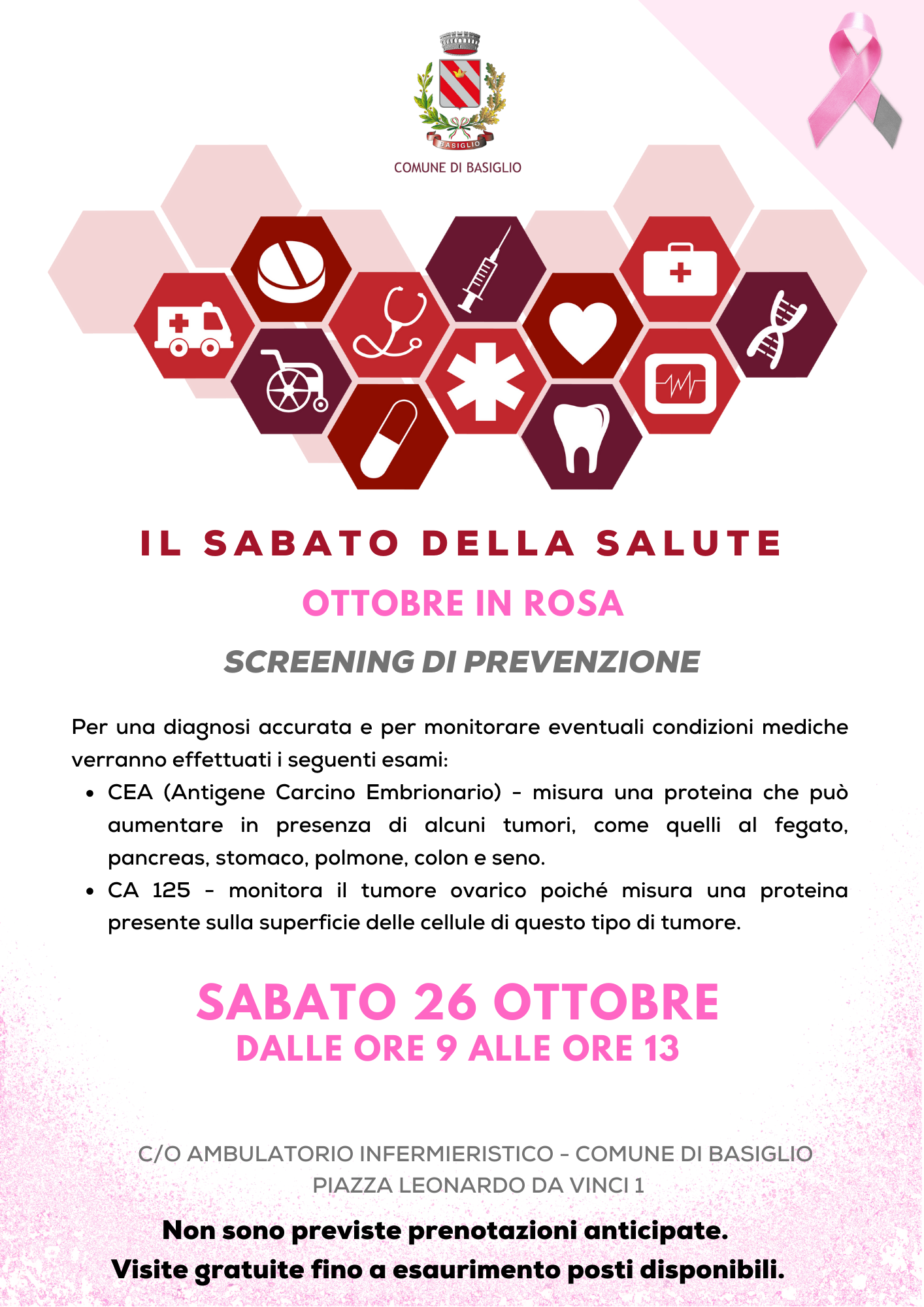 Sabato 26 ottobre dalle ore 9 alle ore 13 presso l’ambulatorio infermieristico del Comune di Basiglio verranno eseguiti due esami utili a monitorare eventuali condizioni mediche: