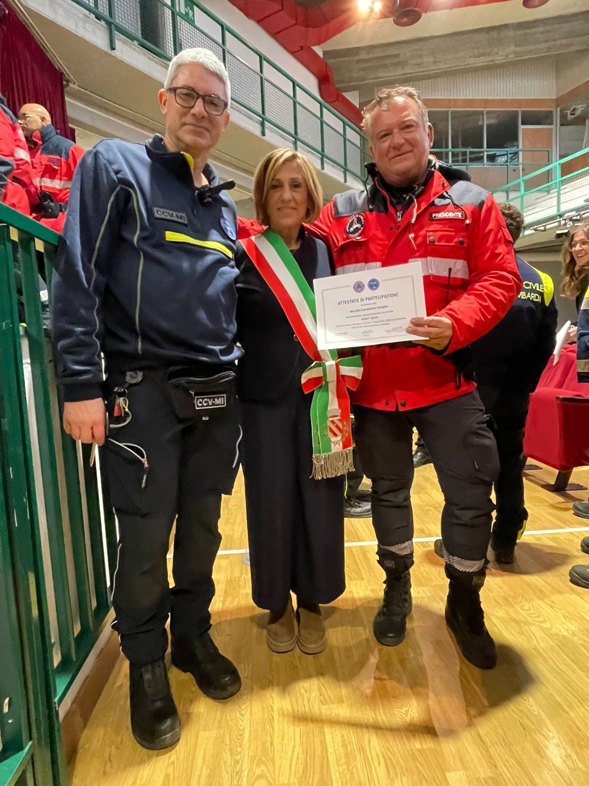 Nella foto, a sinistra della sindaca, il presidente del nucleo basigliese Enrico Masserini e a destra Dario Pasini, presidente del CCV Milano (Comitato di coordinamento del volontariato).