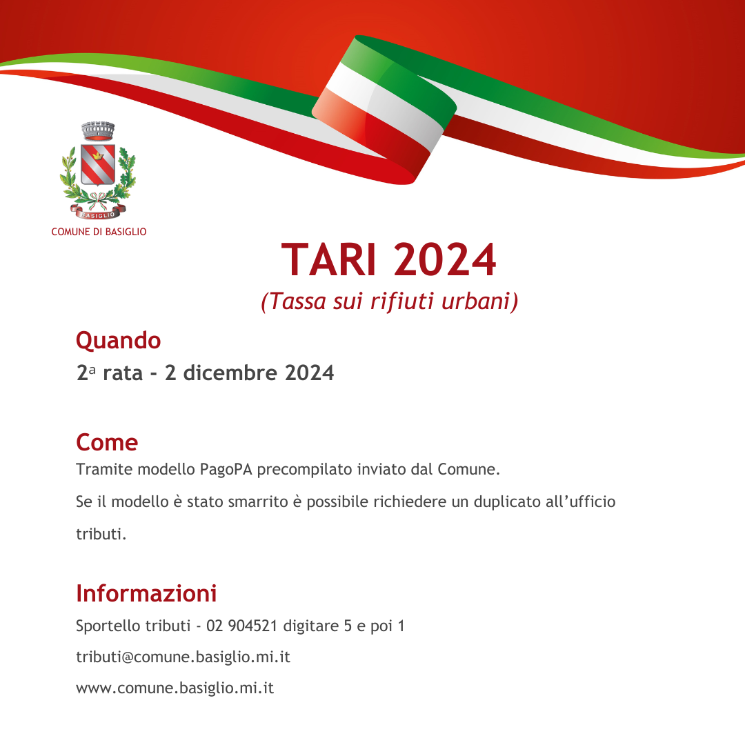 Il Comune di Basiglio ricorda ai cittadini che la scadenza per il pagamento della seconda rata della TARI (Tassa sui Rifiuti) č fissata per il 2 dicembre 2024.
