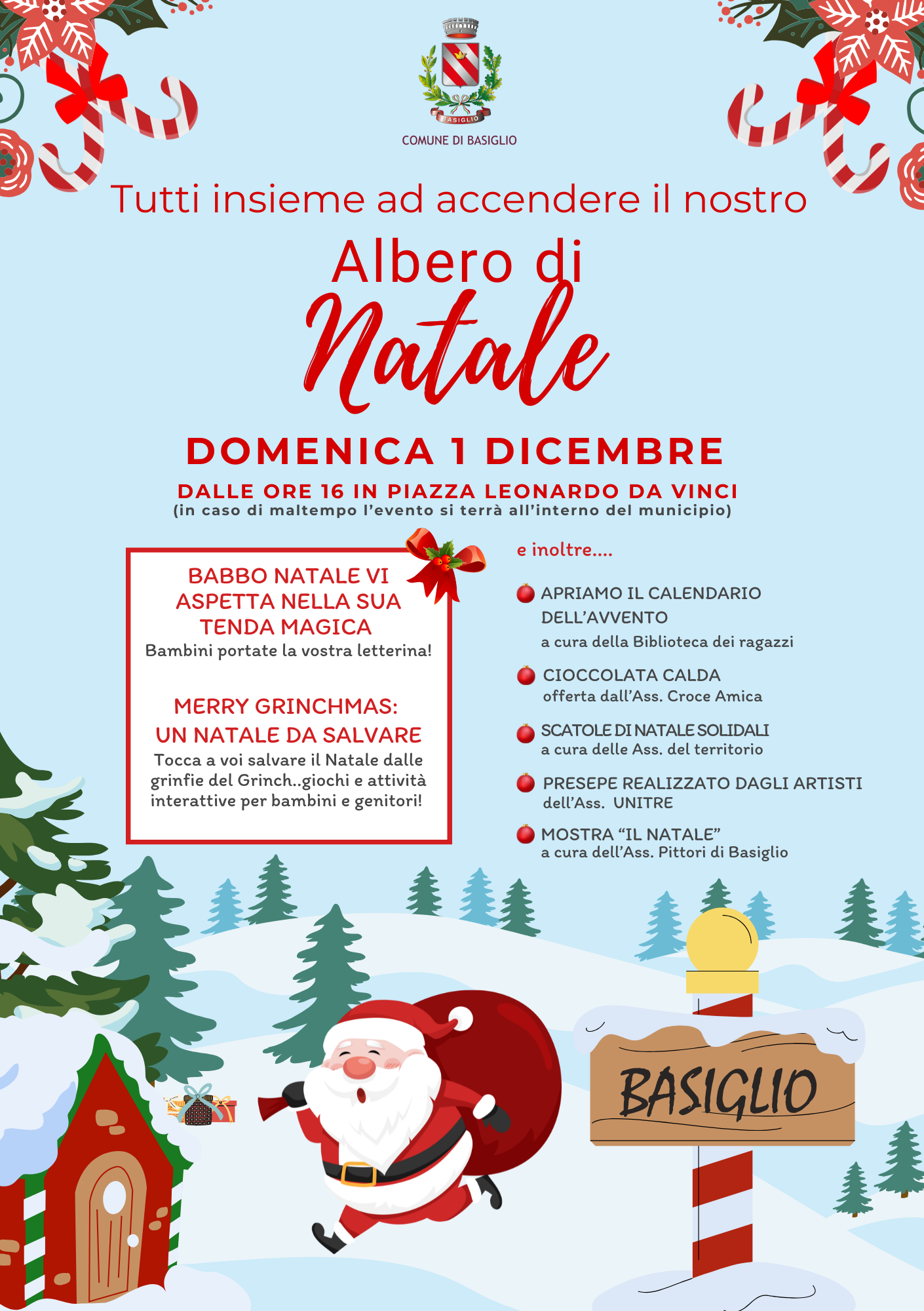 Alle ore 16 di domenica 1 dicembre è in programma l’accensione dell’albero di Natale allestito in piazza Leonardo da Vinci e come da tradizione l’amministrazione comunale ha organizzato una serie di iniziative per tutte le età. Ci sarà la tenda magica di Babbo Natale con giochi e attività interattive per bambini e genitori e “Merry GrinchMas”, una sfida con mamma e papà per salvare il Natale dalle grinfie del Grinch.