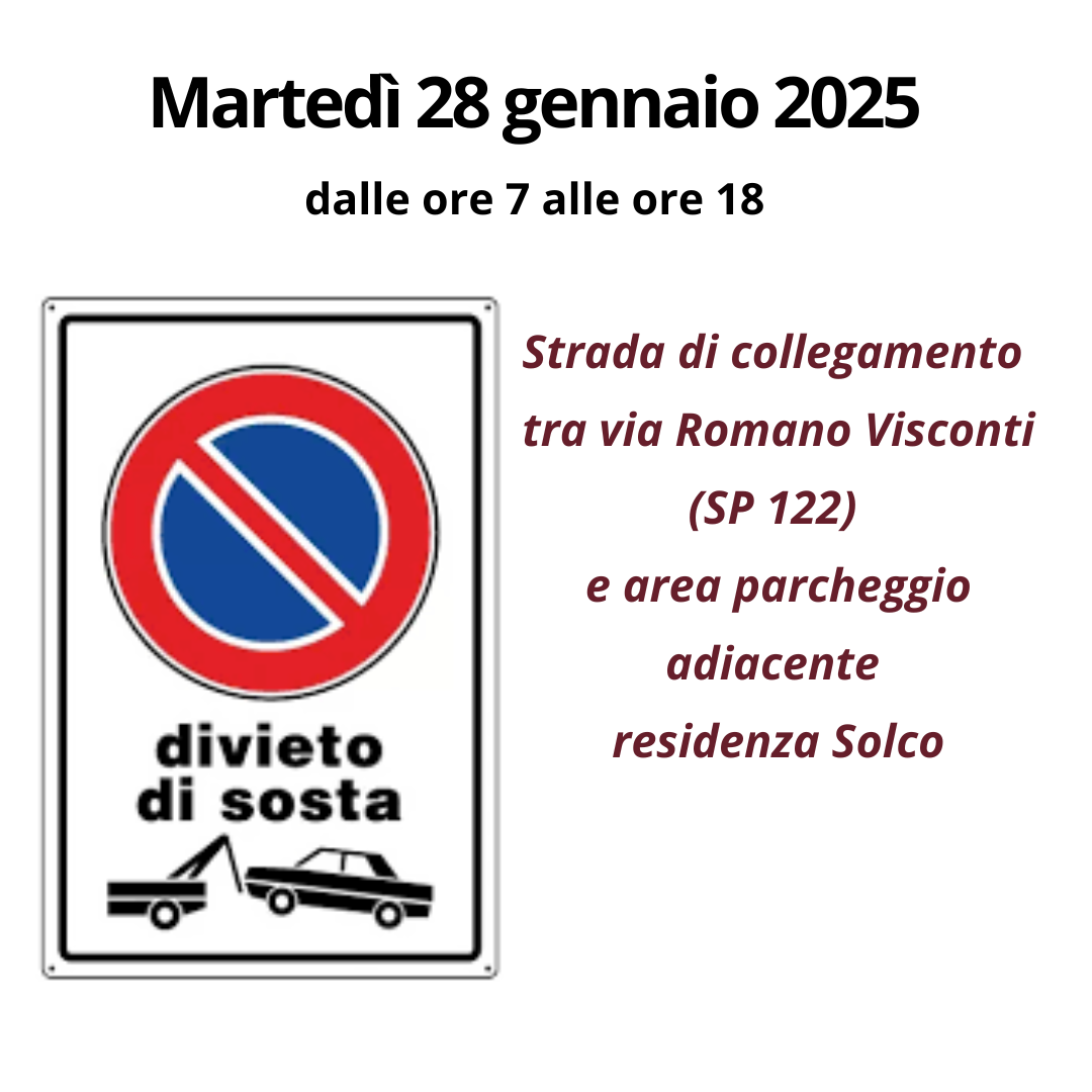 Per lavori stradali, dalle ore 7 alle ore 18 di martedì 28 gennaio, verrà istituito il divieto di sosta (da ambo i lati) con rimozione forzata lungo il tratto di strada di collegamento tra la via Romano Visconti SP 122 e l’area parcheggio adiacente la residenza Solco.