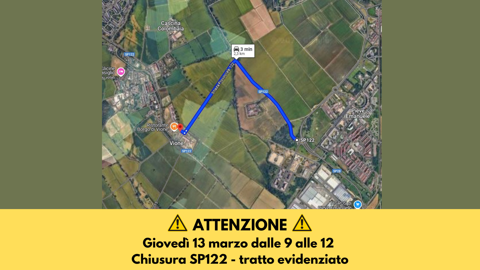 Città Metropolitana ha comunicato che, per lavori di manutenzione, giovedì 13 marzo dalle ore 9 alle ore 12 sarà chiuso il tratto della SP 122 che va dalla rotatoria di Pieve Emanuele fino alla Cascina Vione.