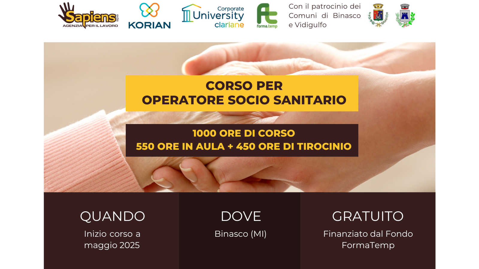 Il Centro per l'Impiego di Rozzano segnala: aperte le iscrizioni al corso OSS (Operatore Socio-Sanitario) di Sapiens e KORIAN SPA, che si terrà a partire da maggio presso il Comune di Binasco.