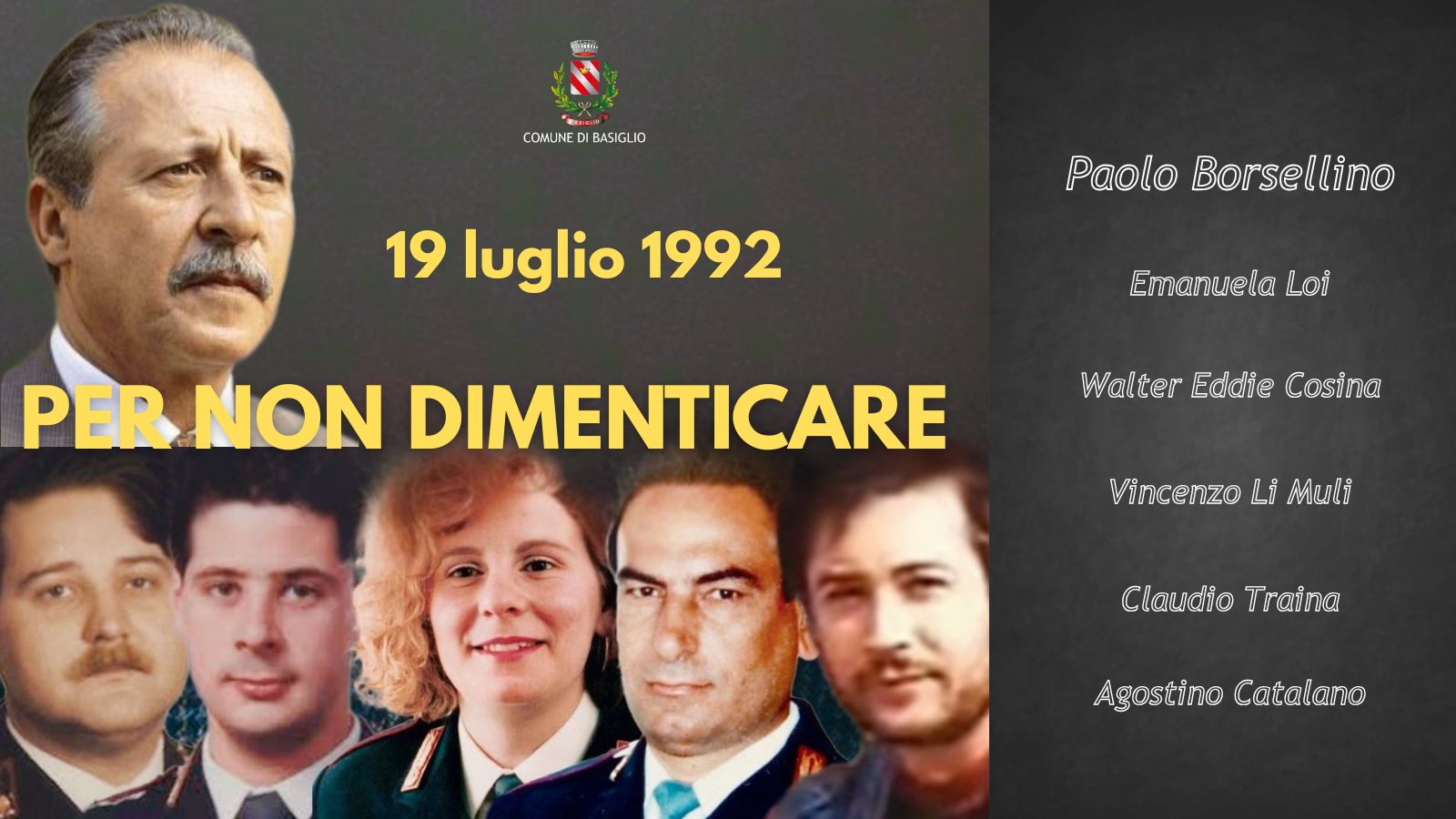 «Vogliamo ricordare – sottolinea la sindaca, Lidia Reale – il giudice Borsellino e tutti gli agenti della sua scorta, tra i quali Emanuela Loi che è stata la pima donna della Polizia di Stato a restare uccisa in servizio. Hanno sacrificato la loro vita per la giustizia e la difesa dello Stato contro la mafia. A 33 anni dalla terribile strage, rimangono vivi nella memoria di tutti noi ».