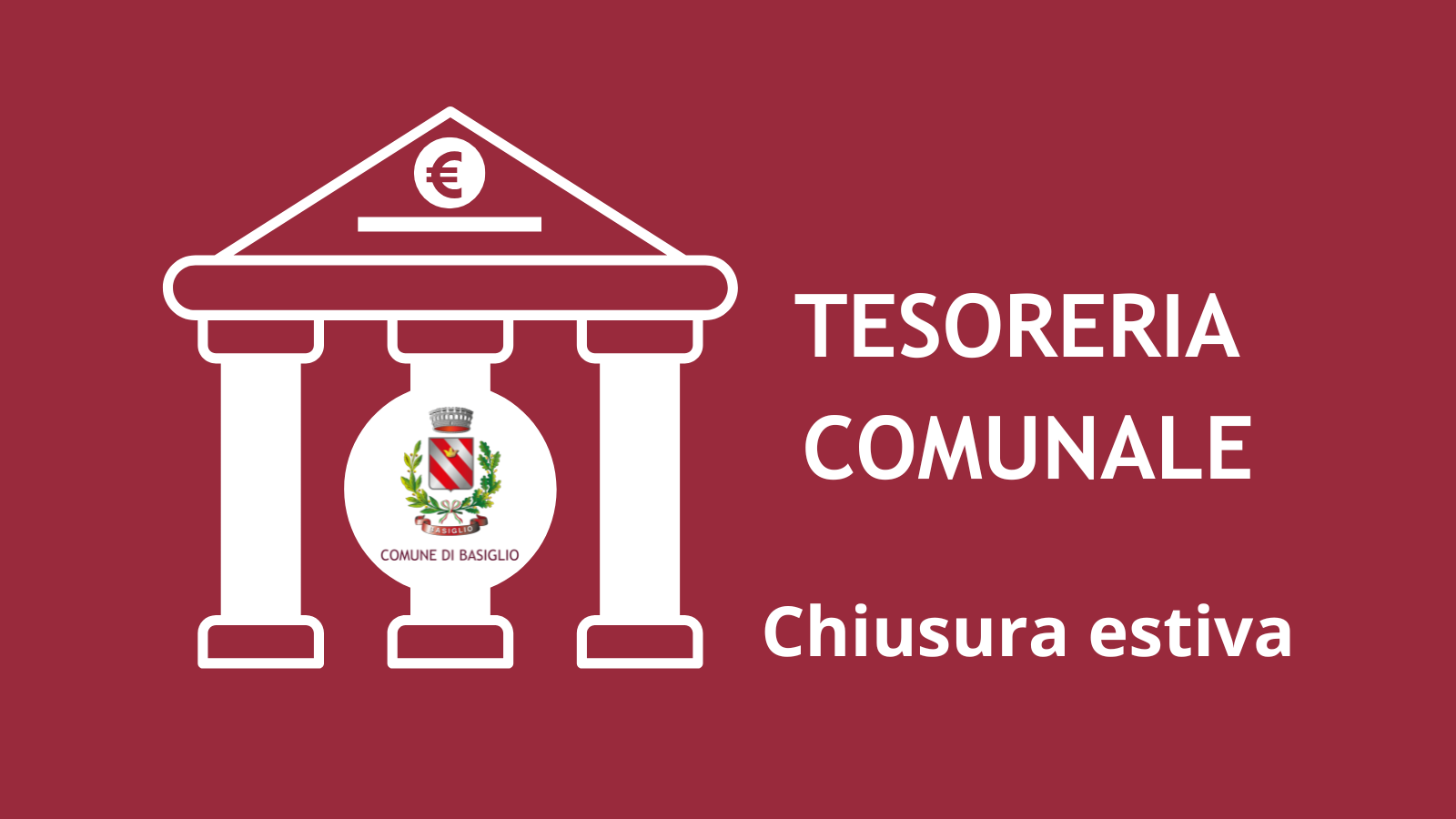 La Tesoreria del Comune di Basiglio resterà chiusa al pubblico da lunedì 11 a giovedì 14 agosto 2025. Il servizio riprenderà regolarmente lunedì 18 agosto 2025.