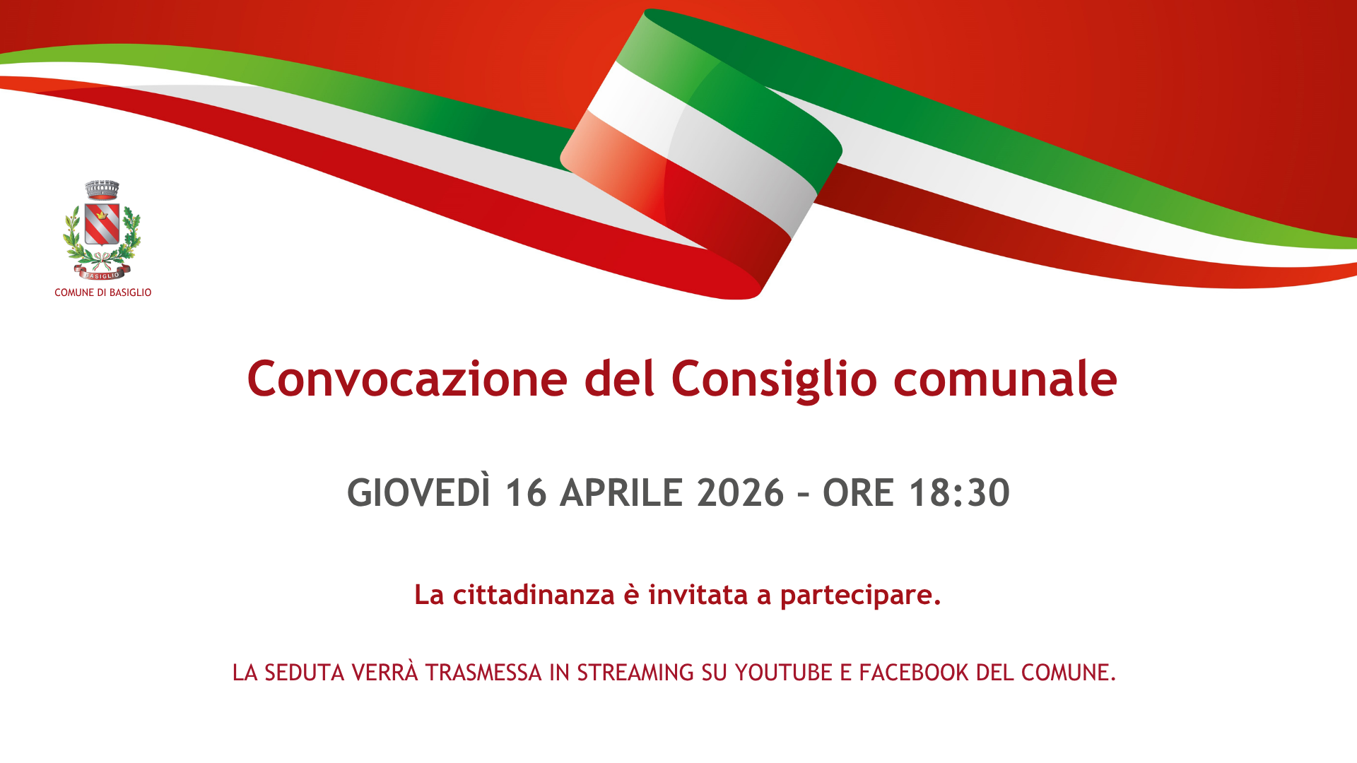Giovedì 16 aprile alle ore 18:30 è convocata la seduta del Consiglio comunale in modalità mista. In allegato l'ordine del giorno.