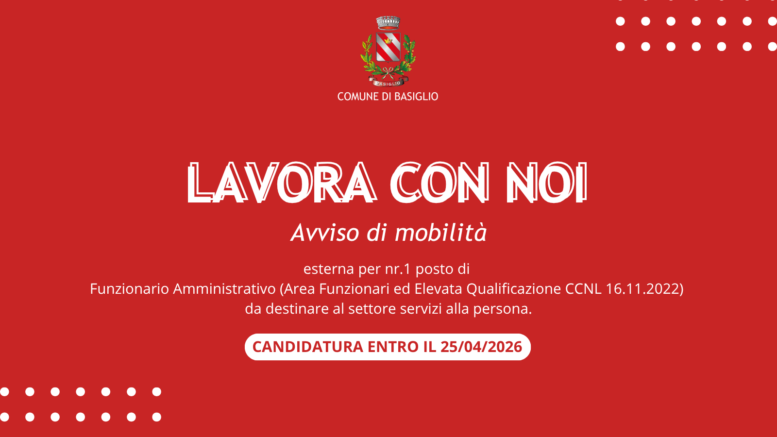 Tutti i dettagli e il testo completo dell’avviso sono disponibili nell'allegato e nella sezione Amministrazione Trasparente – Bandi di concorso del sito comunale.