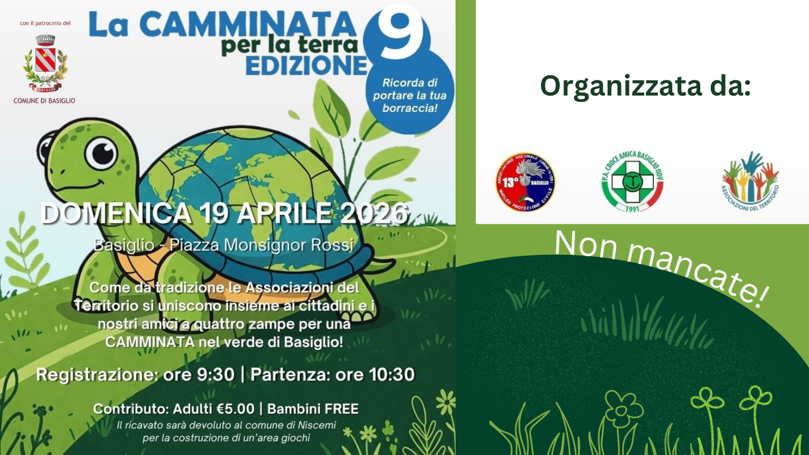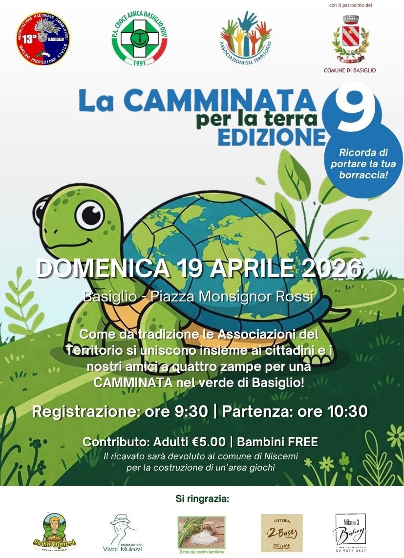 Domenica 19 aprile 2026 torna a Basiglio la “Camminata per la Terra”, giunta quest’anno alla sua nona edizione, in programma dalle ore 10.30 alle 12 in occasione della Giornata Internazionale dell’Ambiente.